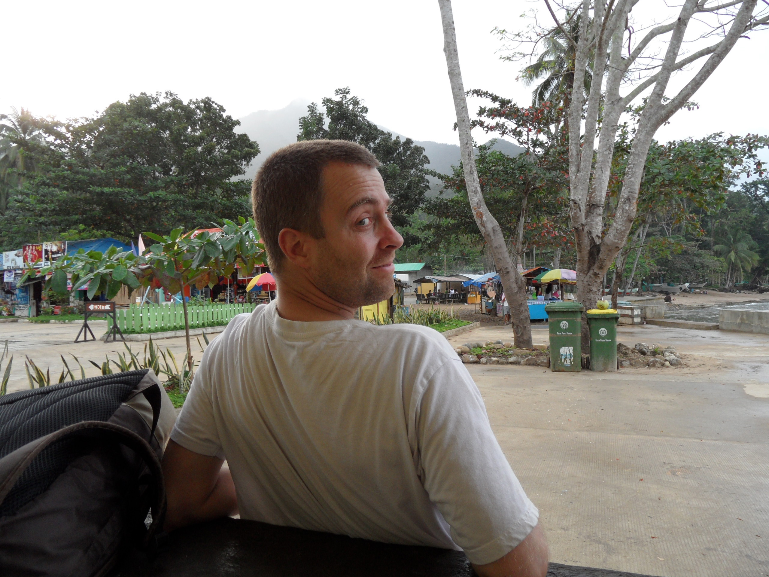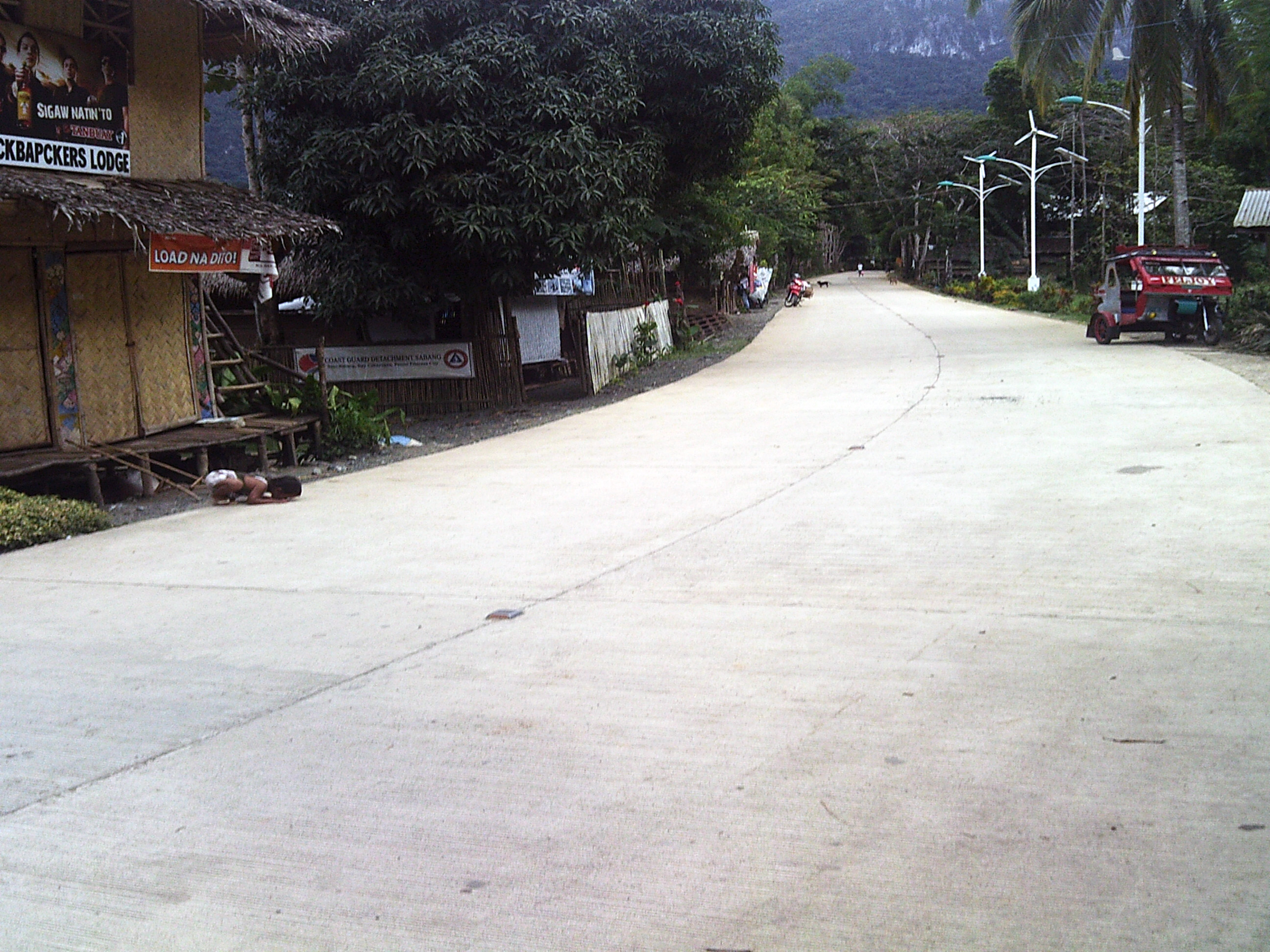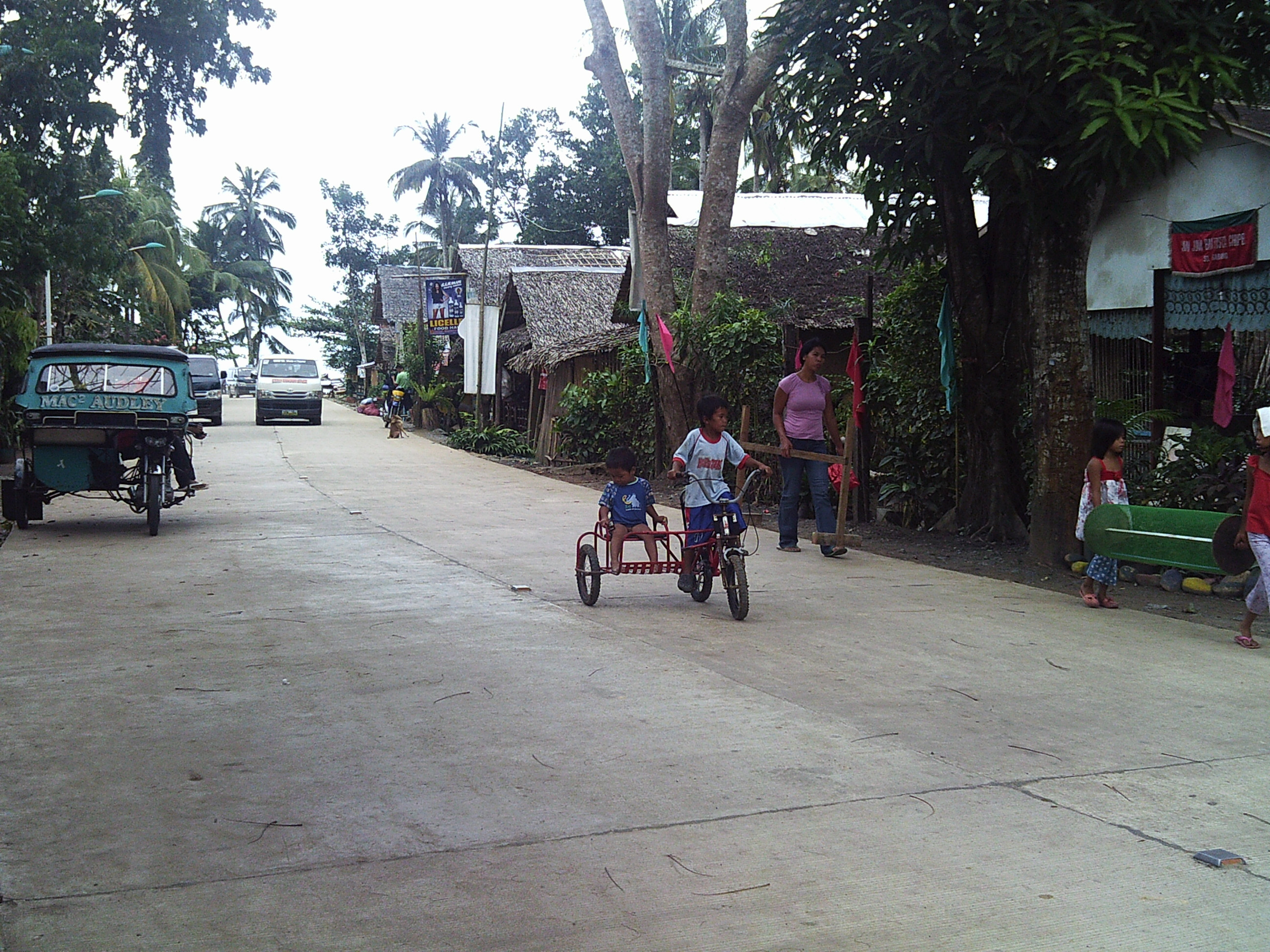 On a un peu de temps. Je profite d'un moment pour aller regarder la rue/route de Puerto, avec les habitants et la vie locale. Je vois des enfants qui jouent, des gens qui travaillent. Ici, l'activité de tricycle est inexistante (il y a bien un ou deux engins, mais rien de comparable par rapport à ce qu'on trouve dans les villes et villages). Les quelques boutiques locales que je vois vendent le strict minimum. Un étal de poisson --je ne sais pas en fait si le terme d'étal est vraiment adapté : c'est surtout une balance et une boite en plastique contenant les poissons. Avec une vieille à côté, qui fait la vente.