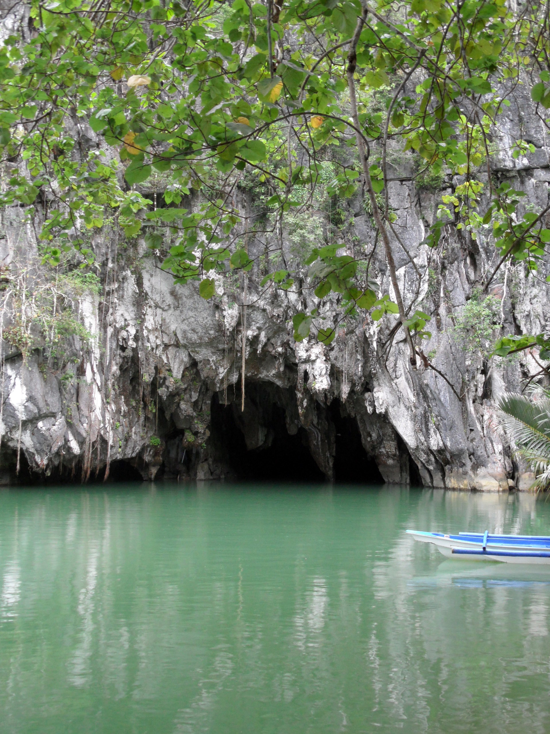 Après quelques dizaines de mètres, on arrive à un embarcadère. De là, il suffit de monter sur un bateau, et d'aller vers la grotte. En fait, un guide installe une batterie de voiture à l'avant de la barque, et y branchera une lampe. Arnaud, qui est devant, tiendra la lampe pendant la visite de la grotte. Le courant de la rivière est insignifiant, ça pourrait aussi bien être un lac. L'eau n'est pas salée (j'ai vérifié). L'entrée de la grotte est à 15m de l'embarcadère, n'espérez donc pas une jolie balade en bateau avant l'entrée sous terre.