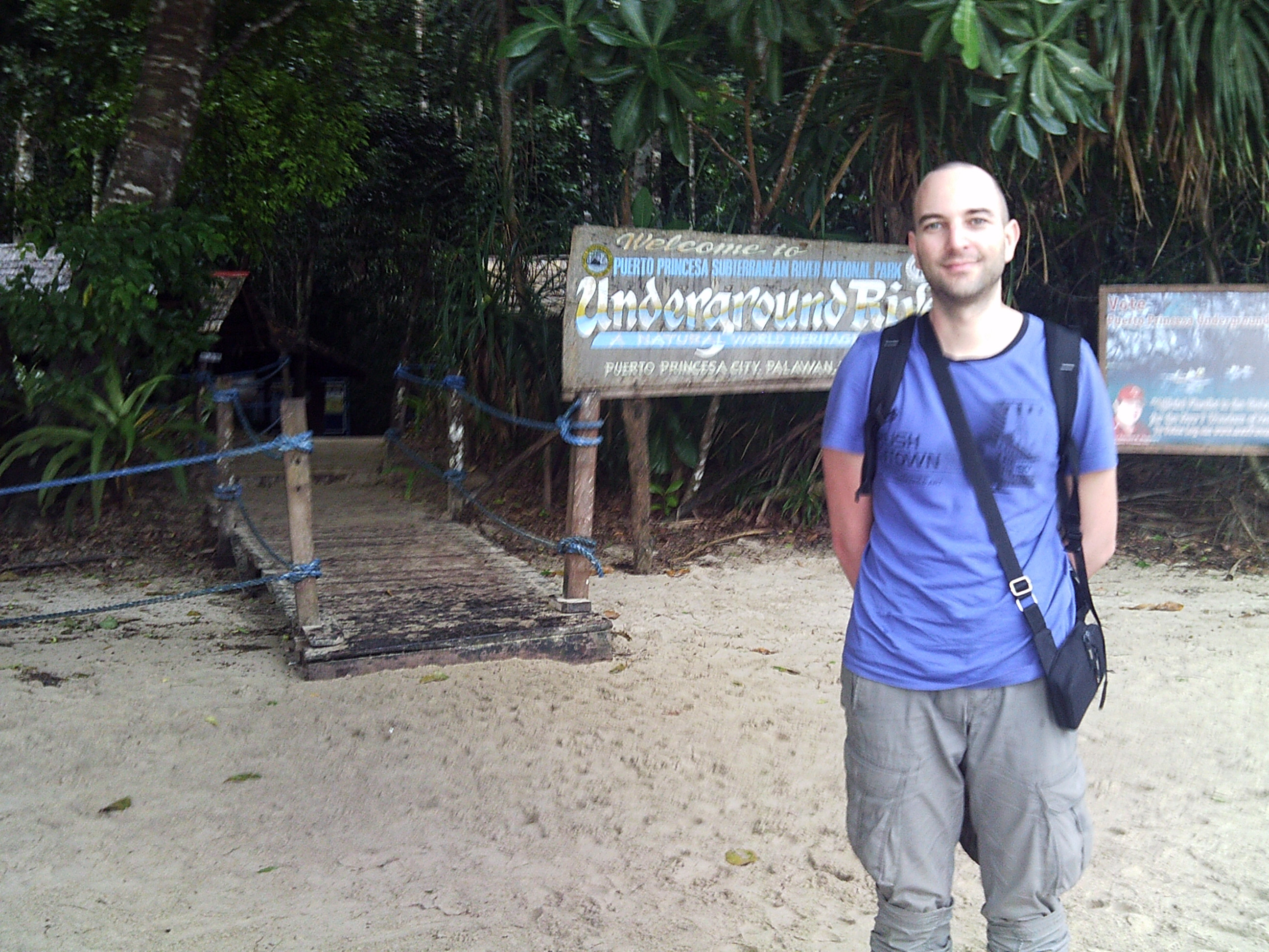 Nous arrivons donc enfin à la plage de la fameuse Underground River, perle et joyau de Palawan. Les bangka à moteur ont pour la plupart une sorte d'échelle-escalier à l'avant, dispositif escamotable qui permet d'en descendre et de rejoindre la plage. On ne se mouille donc que le bas des pattes.