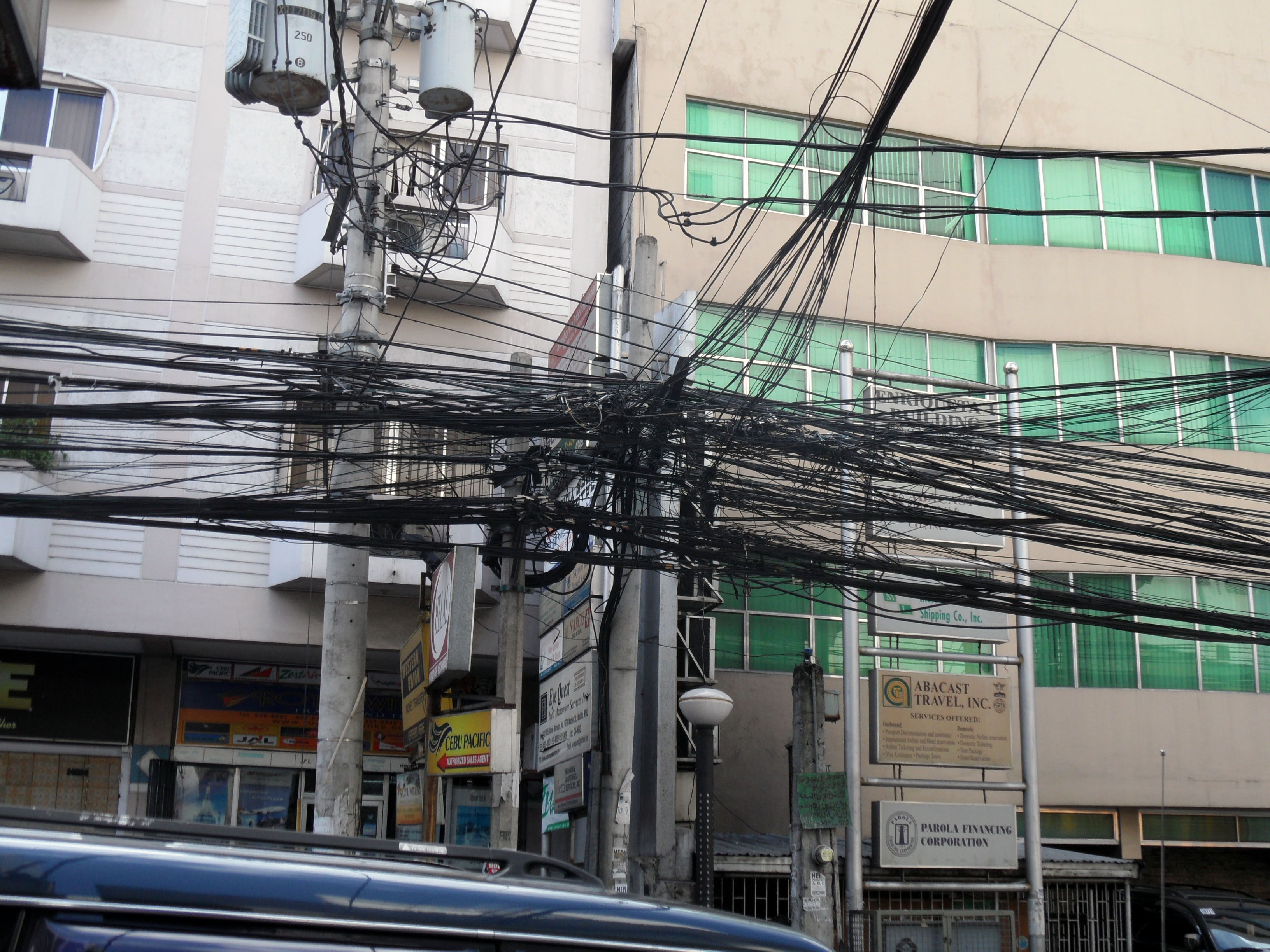 Dans les rues alentours, l'électricité est raccordée de façon particulièrement anarchique...