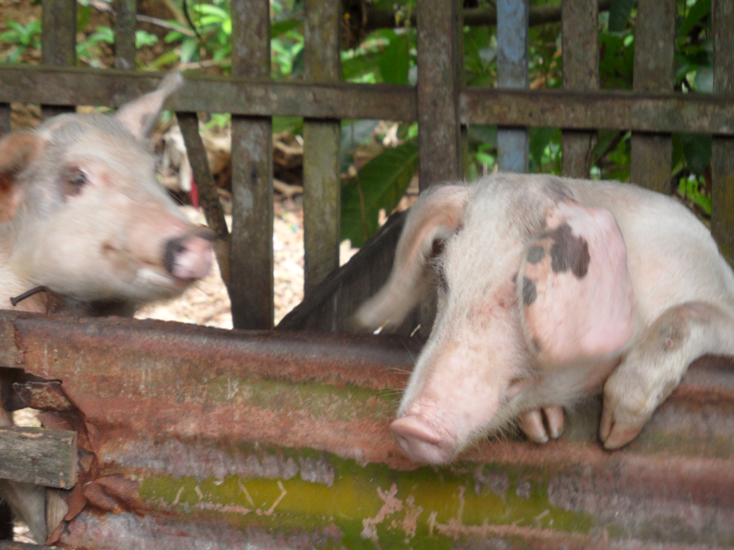 Et là, horreur, je découvre enfin ce qui faisait tout ce raffut : trois cochons sont enfermés dans un parc fermé par des planches bancales et mal ajustées, à peine fixées et faisant face à une petite cabine de fond de jardin, dans laquelle trône un magnifique siège de WC miniature du genre de ceux qu'on trouve dans les écoles maternelles. Ne cherchez pas, il n'y a bien sûr pas d'eau. Les porcs semblent passionnés par ma présence et se bousculent pour se faire prendre en photo... Il est temps de rejoindre Arnaud !