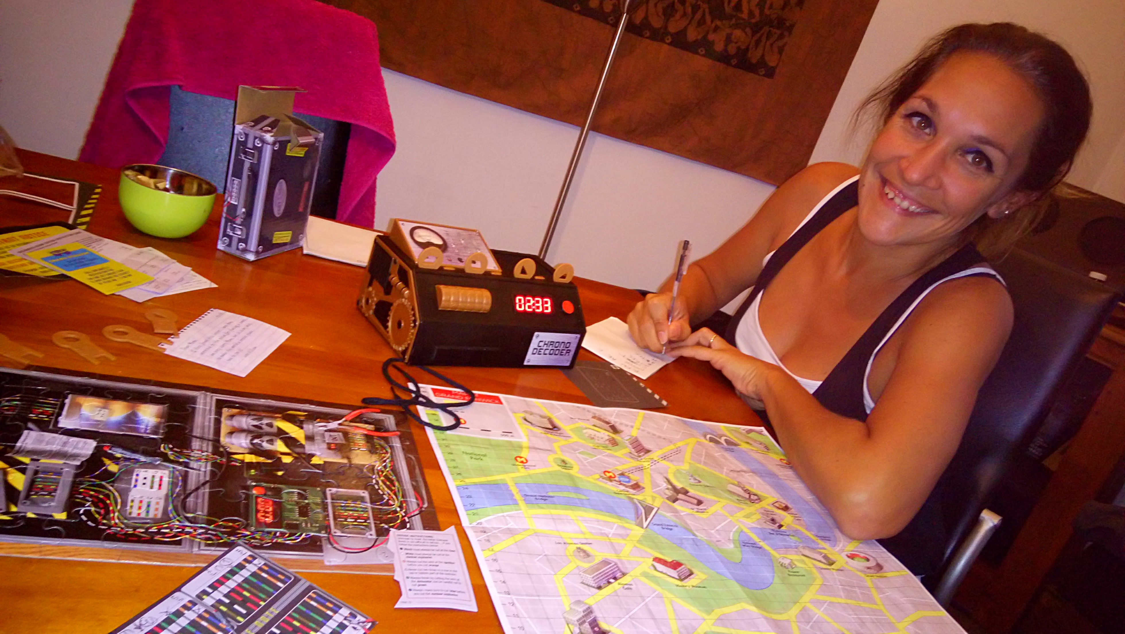 On a beau être loin de vous, on continue à jouer ! On a donc fait un escape game (en version boîte de jeu à la maison), acheté en Australie, joué en Nouvelle-Zélande, le tout en anglais bien sûr ! Le truc est donc plus dur que si c’était en français. Bon, on a quand même réussi, Chrystel a désamorcé la bombe juste à temps !