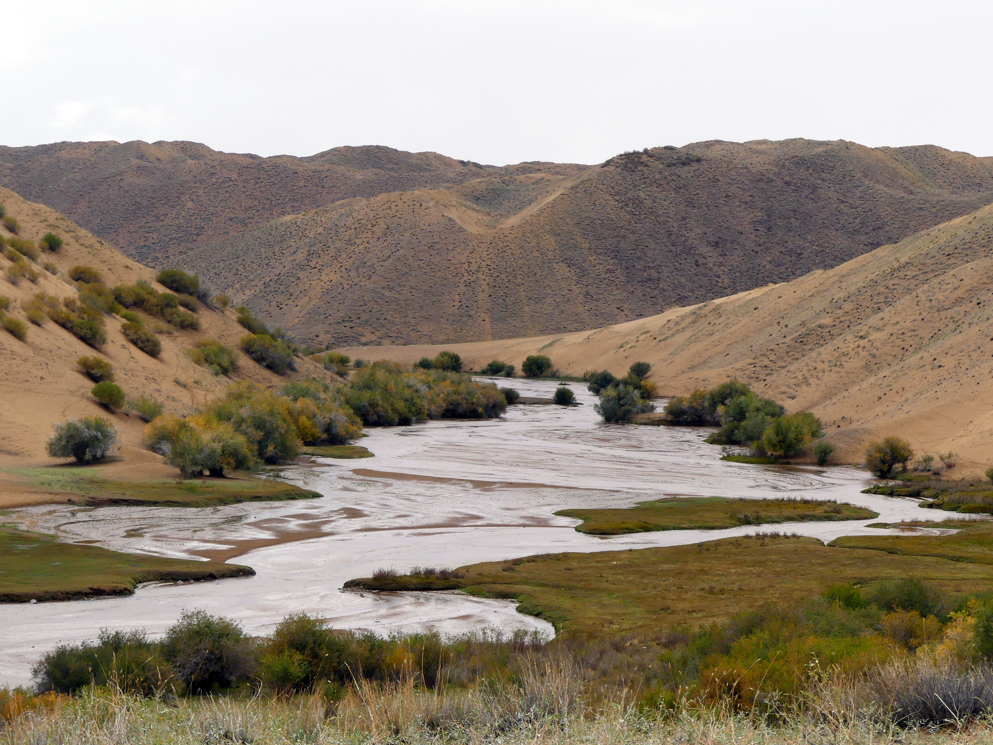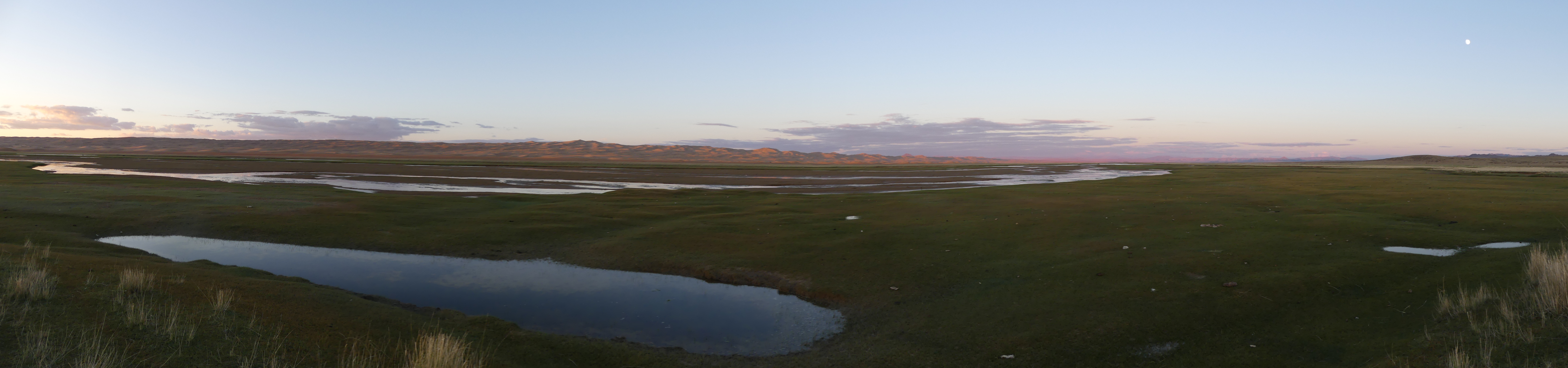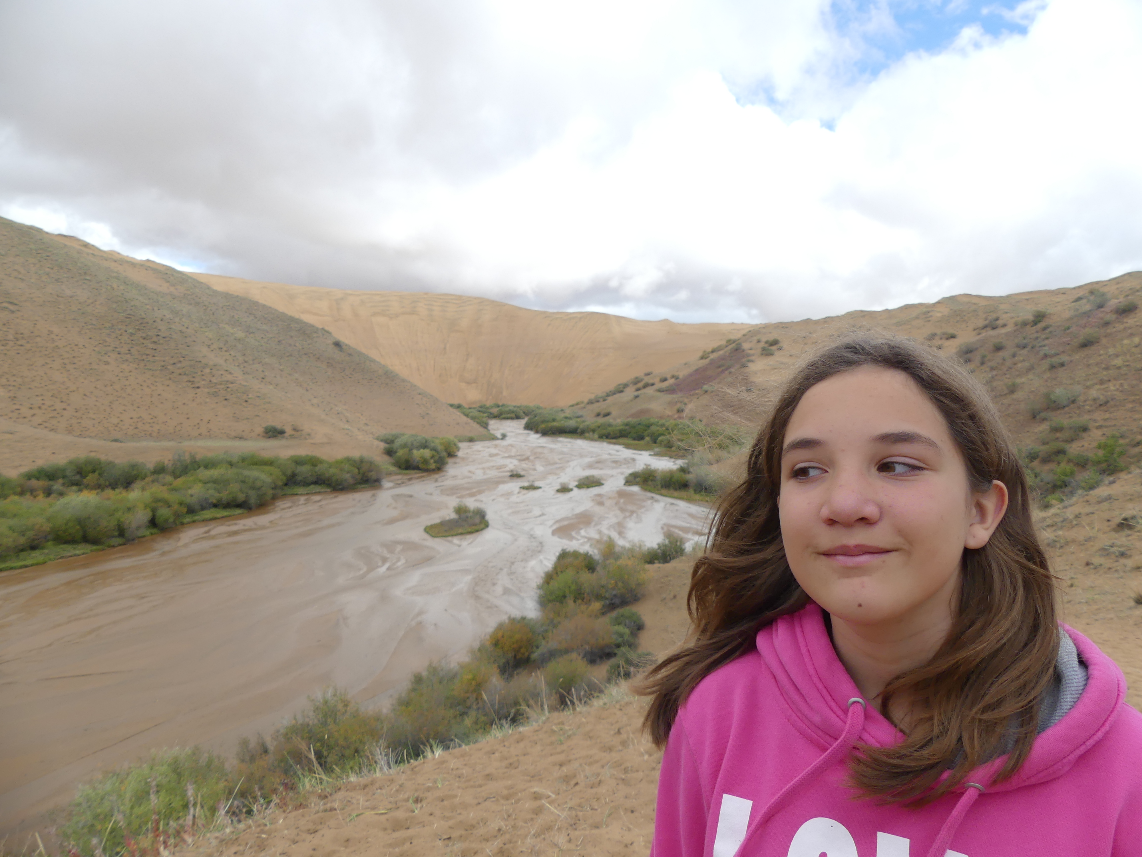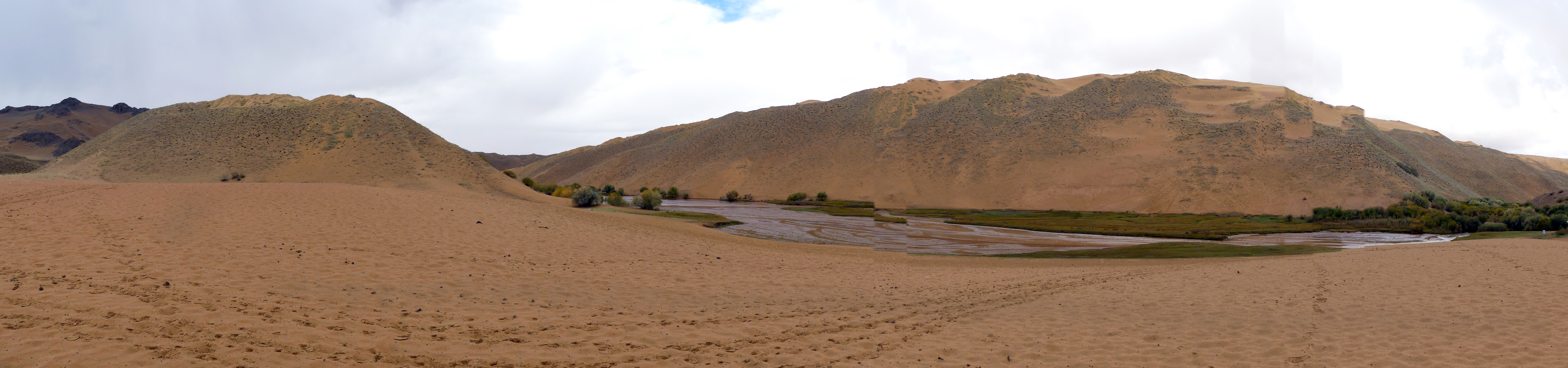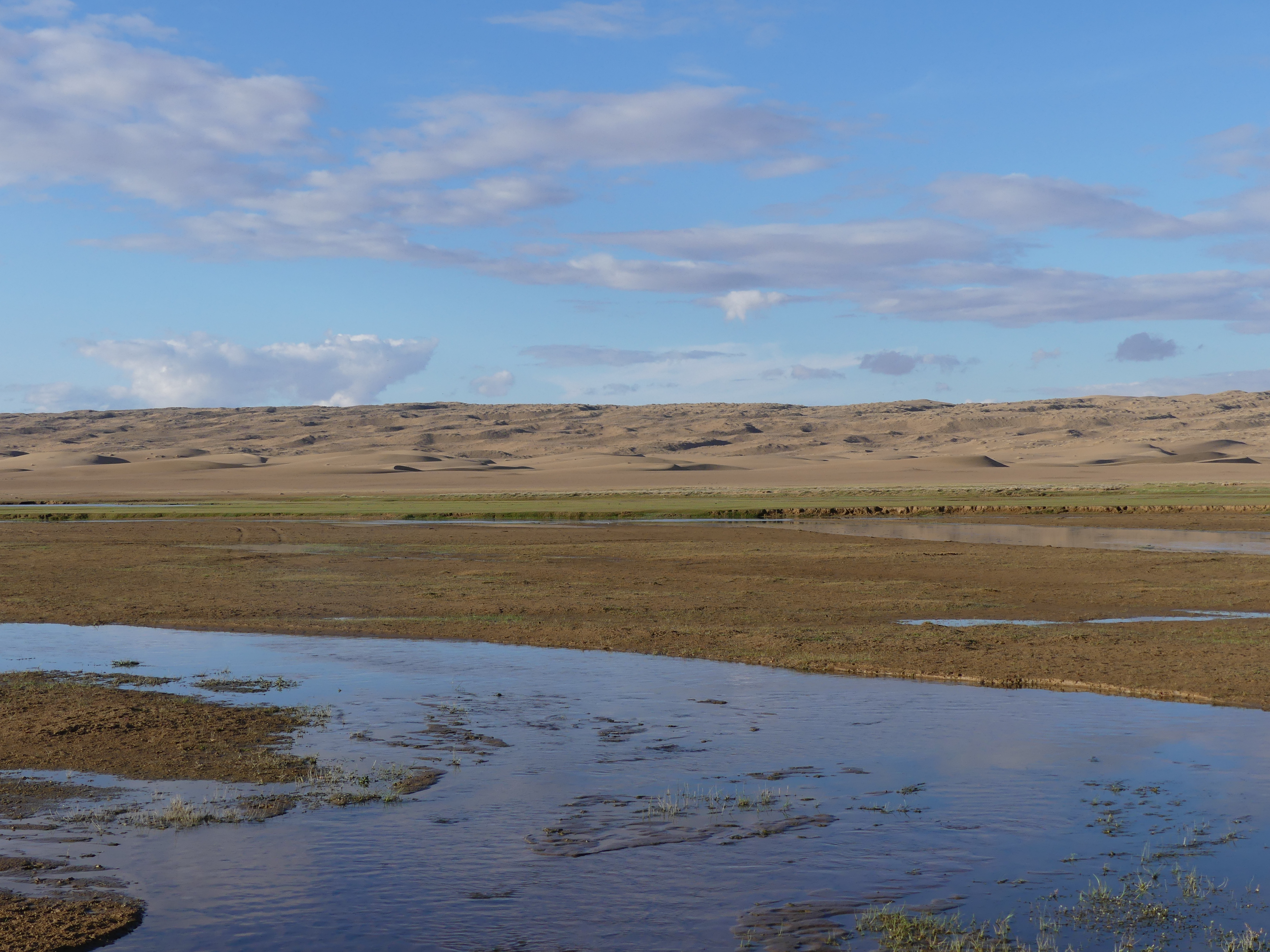 Mais vous vous doutez bien qu’il y a une petite aventure au tournant. Car au moment de repartir, on se fait arrêter au passage par des mongols qui font signe. En fait, on apprend que la zone est devenue un parc national (bonne initiative !) et que du coup il faut payer (ça c’est la suite logique, encore que ça me hérisse moins ici comparé au hold-up du pont du Gard mais je vous en parlerai un autre jour) à hauteur de 3 000 ₮ par personne (ça fait environ un gros euro chacun), le gouvernement a en effet placé une pancarte qui dit qu’il ne faut pas polluer ici. Et bien ma bonne dame, on paye, diantre ! Et on file plus loin, pour poser la tente et dormir au bord des dunes et de la rivière, juste après la limite du parc national. On sera bien tranquilles. On traverse un petit village qui s’appelle végétation (on aura beau chercher, il n’y a pas le moindre brin d’herbe ici).
