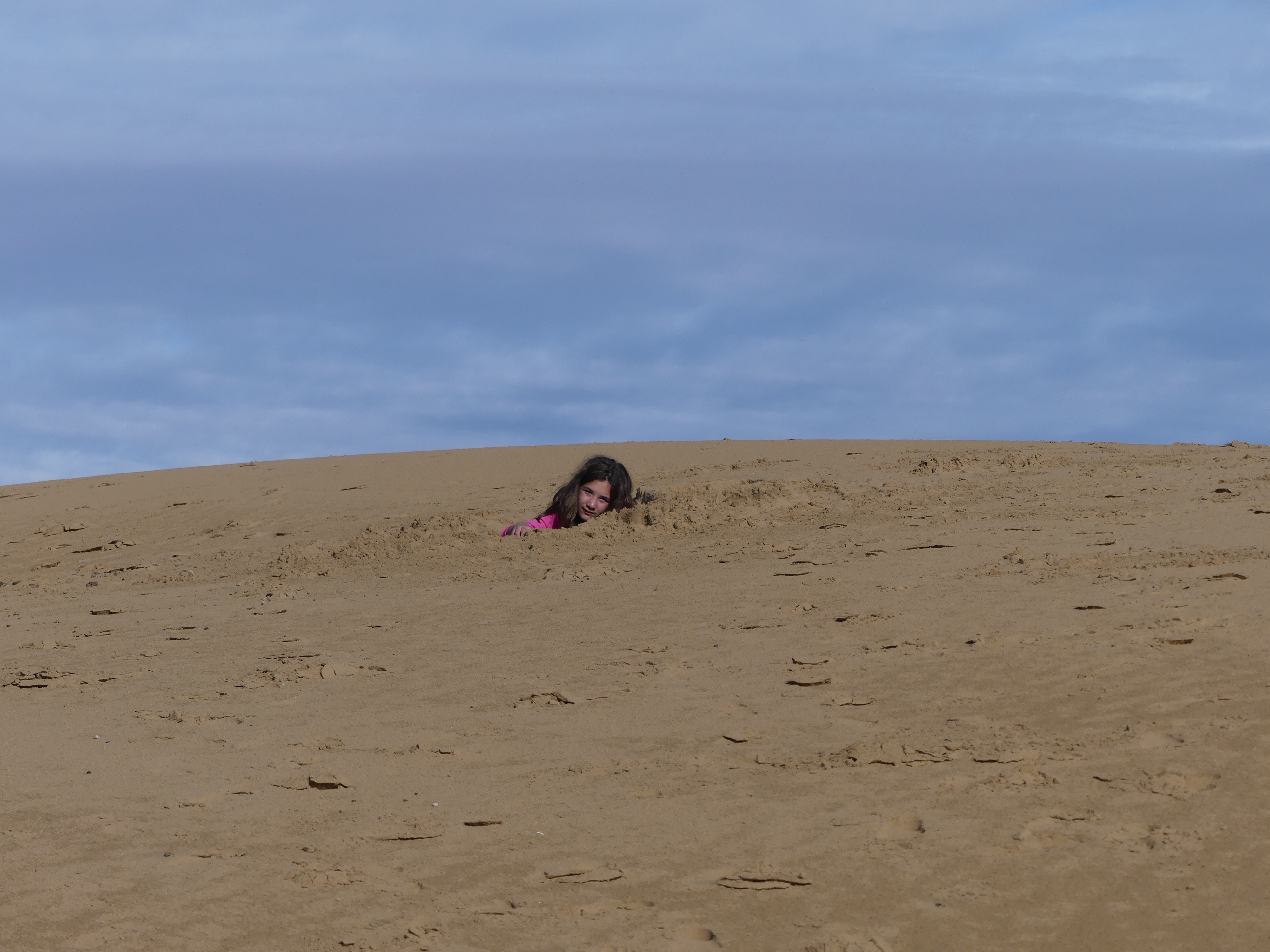 Et comme on est encore à près de 1800m d’altitude, il n’y a pas le moindre insecte pour nous emmerder embêter. On pense avec nostalgie à nos amis qui sont partis en camping en Camargue et qui n’avaient pas pensé aux moustiques… Ils ont pensé à eux en retour, les ptits êtres volants suceurs de sang. Pendant qu’on monte la tente, les filles vont jouer dans le sable de la dune. Et bien quoi, vous n’auriez pas fait pareil vous ? Ah vous voyez !! Audrey fait un gros trou et s’y cache.