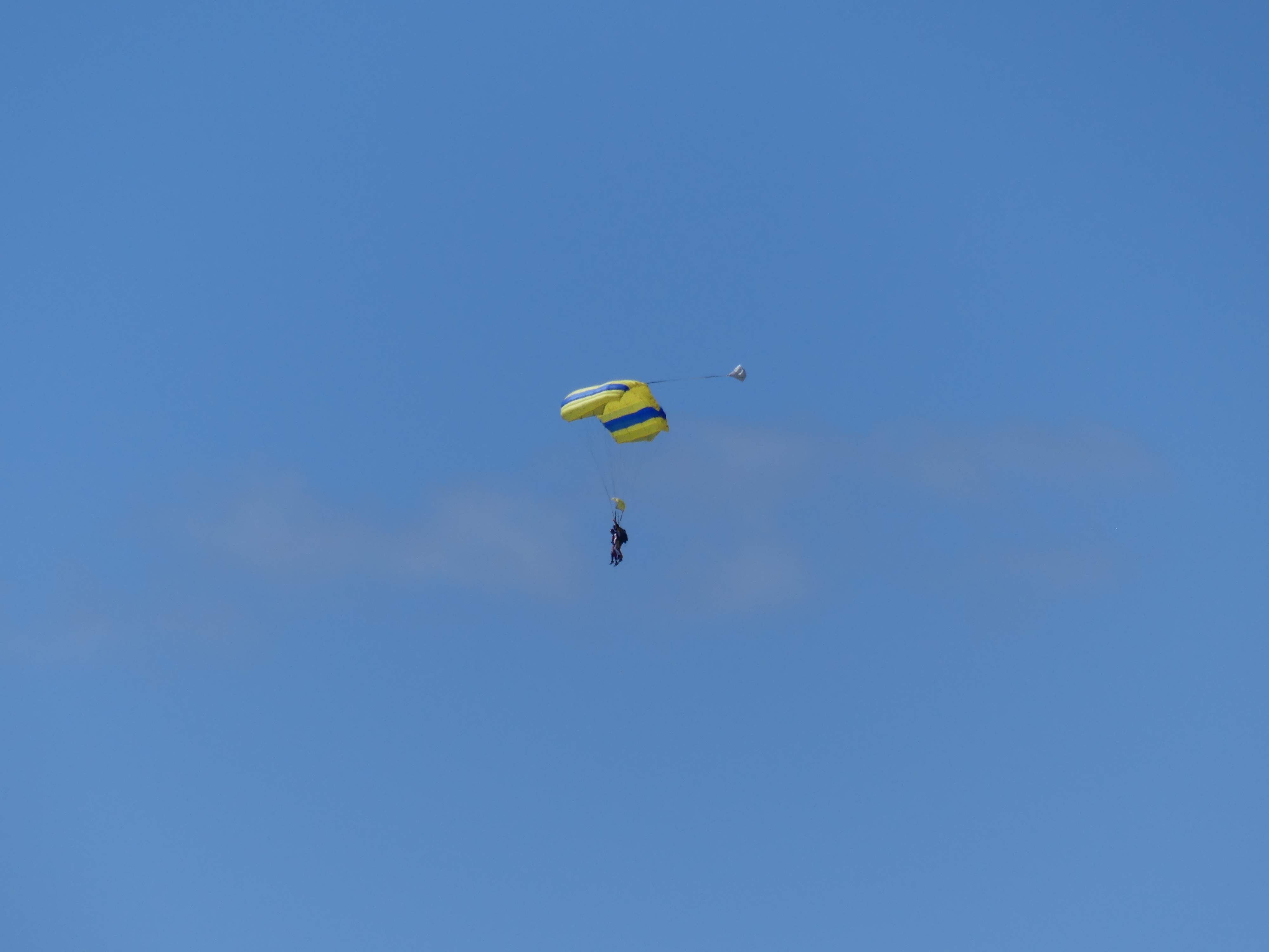 Les parachutes paraissent alignés au cm près ! Eve est devenue blonde !?! Superbe la couleur de l’eau !